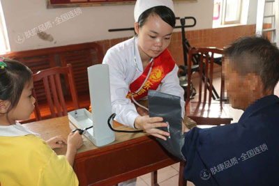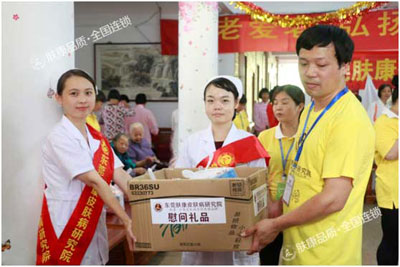 南城肤康皮肤病研究院医疗小分队的医务人员现场为老人义诊,他们的工作台被围了个结结实实,护士邓和珍和皮肤科医生刘英主任一边为老人量血压一边与亲切交谈,告诉他们平时保健方面的知识,在健康服务间隙,肤康的白衣天使们又将为老人准备好的苹果、牛奶、洗衣粉、纸巾等慰问礼品分发给现场老人,老人竖起大拇指表示,对像这样又送慰问品又解决他们实际问题的活动连声说好。